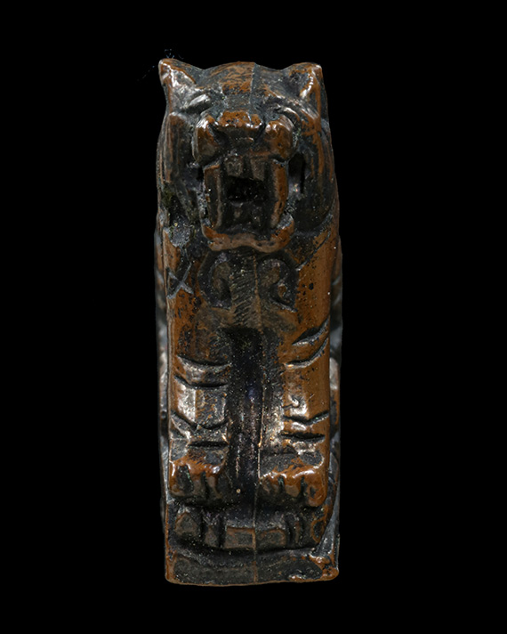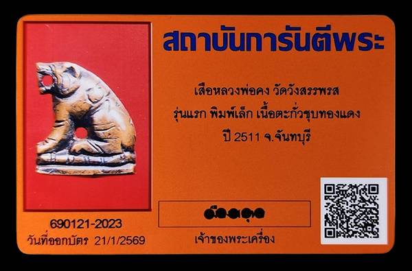 เสือหลวงพ่อคง วัดวังสรรพรส รุ่นแรก พิมพ์เล็ก เนื้อตะกั่วชุบทองแดง ปี 2511 จ.จันทบุรี พร้อมบัตรG...