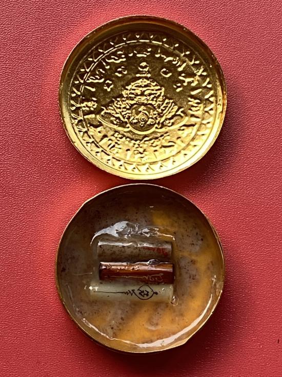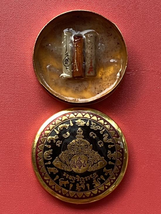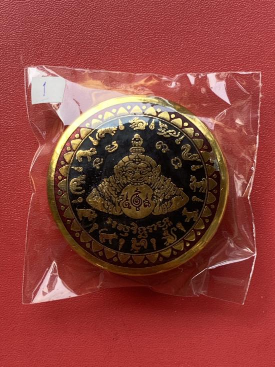 เคาะเดียวแดง สีผึ้งพระราหู รุ่น มงคลจักรวาล เนื้อ โลหะชุบทองลงยาสีดำขอบสีแดง ขนาด 5ซม |