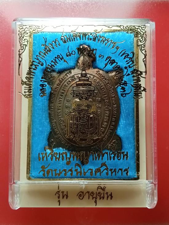 พญาเต่าเรือน รุ่นอายุยืน ฉลองพระชนมายุ ๘๐ พรรษา ๓ ตุลาคม ๒๕๓๖ เนื้อนวโลหะผสมชนวนพระสังกัจจายน์ญส.ปี ๒๕๓๐ (พระสังกัจจายน์ญส.รุ่นแรก ปี ๒๕๓๐ เป็นรุ่นสำคัญมีส่วนผสมของชนวนพระกริ่งบวรรังสี ๒๕๒๘ และชนวนพระกริ่งปวเรศ ๒๕๓๐ ล้วน ๆ โดยไม่มีชนวนพระรุ่นอื่นเจือปนเลย) พิธีพุทธาภิเษก-ชัยมังคลาภิเษก ณ พระอุโบสถวัดบวรนิเวศวิหาร หลวงปู่หลิว ปณฺณโก วัดไร่แตงทอง เทพเจ้าแห่งพญาเต่าเรือน ร่วมปลุกเสกในพิธี หลวงพ่อเปิ่น หลวงพ่อแย้ม วัดสามง่าม หลวงพ่อพูล วัดไผ่ล้อม หลวงพ่อไสว วัดปรีดาราม หลวงพ่อแช่ม วัดดอนยายหอม หลวงพ่อยิด วัดหนองจอก หลวงพ่อสง่า วัดบ้านหม้อ ฯลฯ ร่วมพิธี เคาะเดียว พระมาพร้อมกล่องเดิม ตอกโค๊ต ซิ่ว ภาษาจีน ที่แปลว่าอายุยืนโดยตอกคนละฝั่งกับเนื้อทองแดงเป็นการจำแนกเนื้อหา