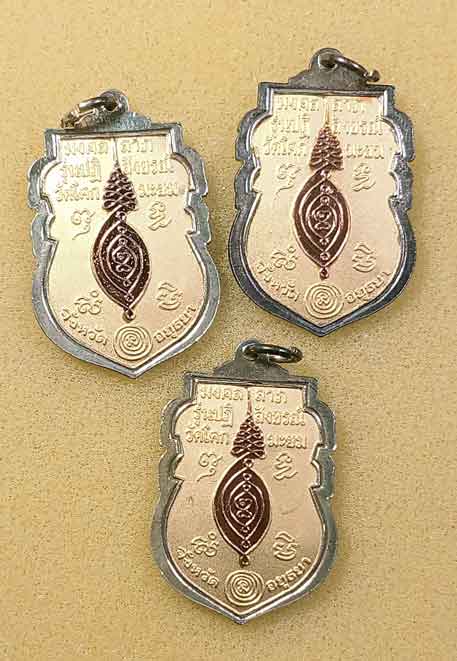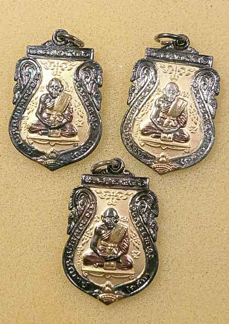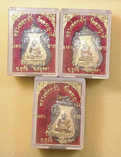 ชื่อพระเครื่อง เหรียญเนื้อสามกษัตริย์ หลวงพ่อกลั่น วัดพระญาติ รุ่น มงคลลาภ พศ. 2546 ออกวัดโคกมะยม 3 เหรียญกล่องเดิม
