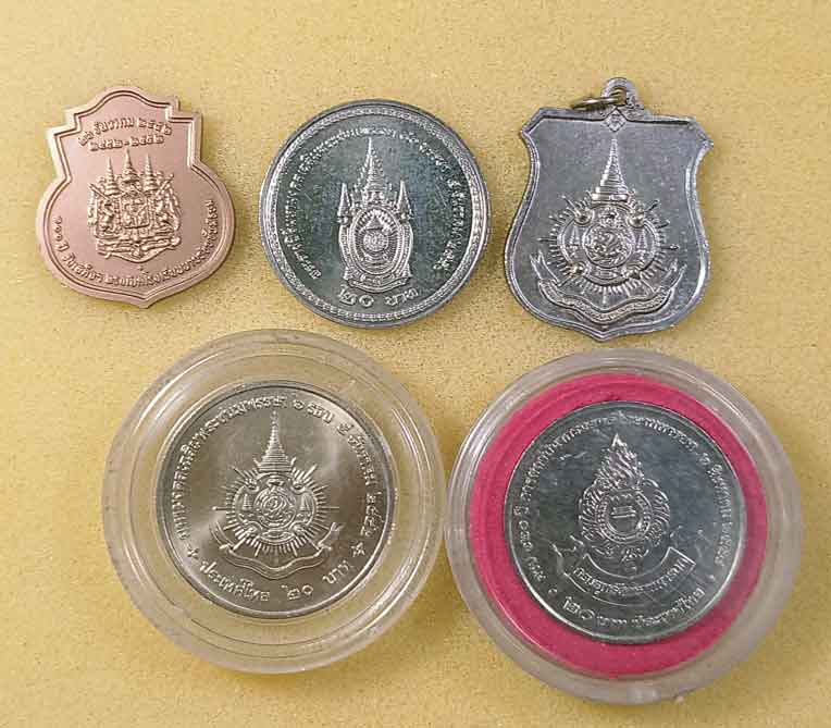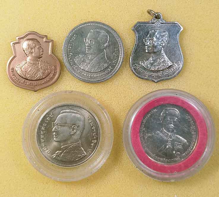 เหรียญร.5 2 เหรียญ + เหรียญร.9 3 เหรียญ +ล็อกเก็ต ร.9 2 องค์ + สมเด็จพระนางเจ้าสิริกิติ์ +เหรียญร.10. |