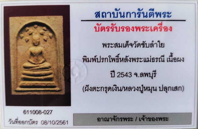 พระสมเด็จวัดซับลำใย พิมพ์ปรกโพธิ์หลังพระแม่ธรณี หลวงปู่หมุน ปลุกเสก เนื้อผง ปี 2543 จ.ลพบุรี ( ฝังตะกรุดเงิน2ดอก หายาก สร้างน้อย ) สภาพสวย พร้อมบัตรรับรอง ### 027 ### |