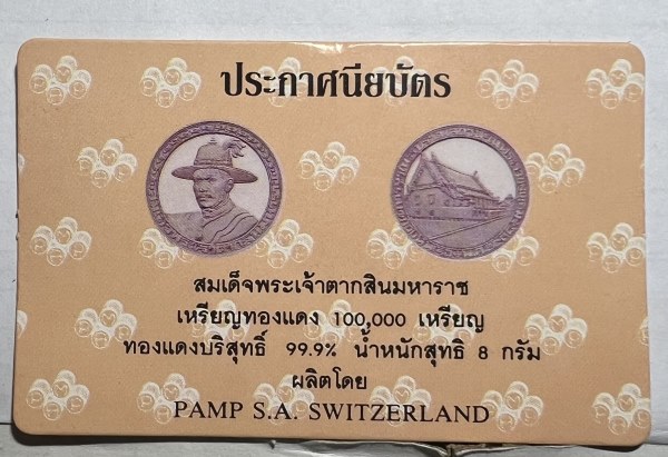 เหรียญสมเด็จพระเจ้าตากสินมหาราช ที่ระลึกโครงการบูรณะโบราณสถานในบริเวณพระราชวังเดิม ปี 2538 เนื้อทองแดงบริสุทธิ์ 99.9% ขัดเงา น้ำหนัก 8 กรัม ผลิตโดย PAMP S.A. SWITZERLAND พร้อมใบประกาศนียบัตร เหรียญสภาพสวย ราคาเบาๆ ลองพิจารณาดู รับประกันตามกฎ จัดส่ง EMS ครับ |