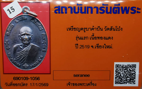 เหรียญครูบาคำปัน วัดสันโป่ง รุ่นแรก เนื้อทองแดง ห่วงเดิม ปี2519 จ.เชียงใหม่ + บัตรG-pra สภาพเดิมค่ะ