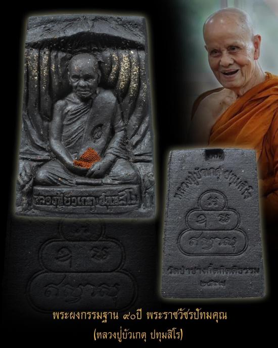พระผงกรรมฐาน 90 ปี พระราชวัชรปัทมคุณ (หลวงปู่บัวเกตุปทุมสิโร) มวลสารผงกรรมฐาน เกศาและจีวร กดพิมพ์โบราณ เนื้อสีดำ |