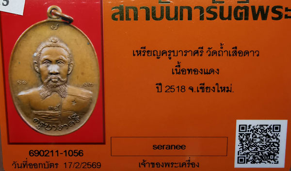 เหรียญครูบาราศรี วัดถ้ำเสือดาว เนื้อทองแดง ห่วงเดิม ปี2518 จ.เชียงใหม่ + บัตรG-pra สภาพเดิมค่ะ