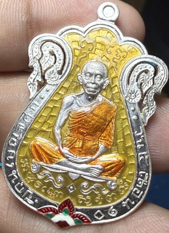 เหรียญเสมาที่รฤกเลื่อนสมณศักดิ์ 57 ออกวัดบ้านไร่ ปี 57 เนื้อลงยาเหลือง เงินหลังเรียบ ฉลุมือ หมายเลข 12 สภาพสวย เคาะเดียวแดง