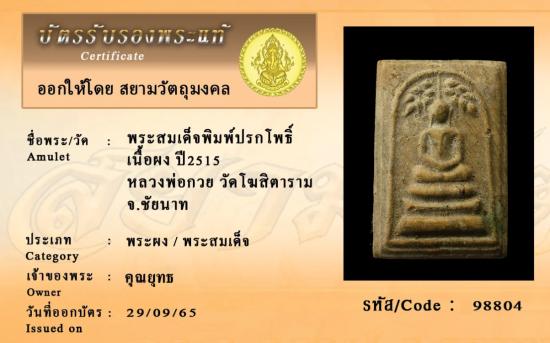 พระสมเด็จพิมพ์ปรกโพธิ์ เนื้อผง ผงน้ำมัน ปี2515 หลวงพ่อกวย วัดโฆสิตาราม จ.ชัยนาท **มีบัตรรับประกันแท้ จาก**โทนบางแค**(T-amulet พระเครื่องเมืองไทย) เคยออกบัตร2สถาบันแต่มีบัตรใบเดียว