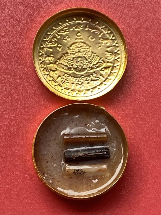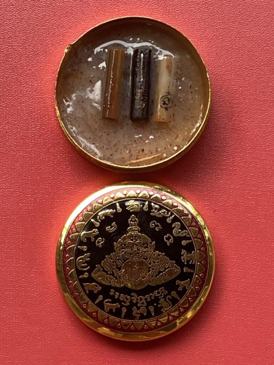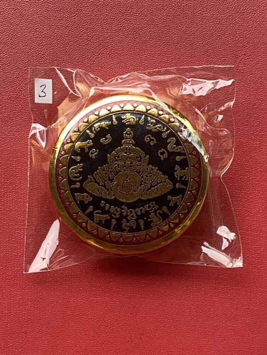 เคาะเดียวแดง สีผึ้งพระราหู รุ่น มงคลจักรวาล เนื้อ โลหะชุบทองลงยาสีดำขอบสีแดง ขนาด 5ซม |
