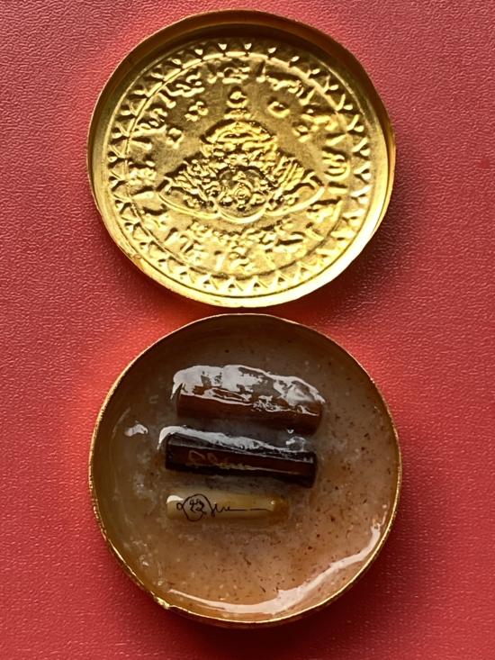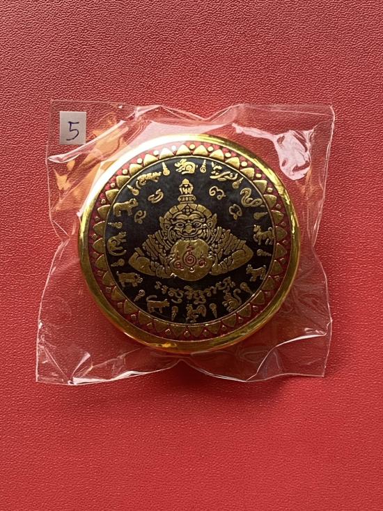 เคาะเดียวแดง สีผึ้งพระราหู รุ่น มงคลจักรวาล เนื้อ โลหะชุบทองลงยาสีดำขอบสีแดง ขนาด 5ซม |