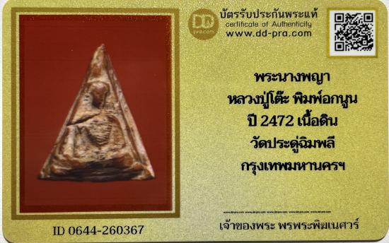 พระนางพญาเนื้อดิน หลวงปู่โต๊ะ วัดประดู่ฉิมพลี พิมพ์อกนูน ปี 2472 พร้อมบัตร G-PRA