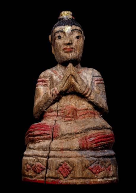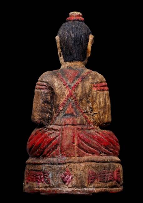 กุมารไม้แกะเก่า สูง 9 เซนติเมตร ก้นอุดผงลงชาดแดงไม่ทราบที่ |