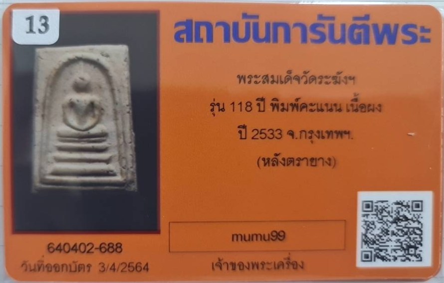 ## สมเด็จวัดระฆัง อนุสรณ์ 118ปี พ.ศ.2533 พิมพ์คะแนน "พระสวยเดิมไม่ผ่านการใช้.หลังปั้มตรายาง...พร้อมบัตรรับรอง.""รับประกันแท้ตลอดฃีพและแท้ตามมาตรฐานสากล....... อนาคตดี ถูกๆเลยครับ.... ราคายังไม่แรง....ไปออกต่อได้เลยครับ...แท้...ถูก...ดี...น่าเก็บมาก. หลังพระล่างมุมซ้ายมีกระเทาะนิดนะครับ ตามรูปเลยครับ |