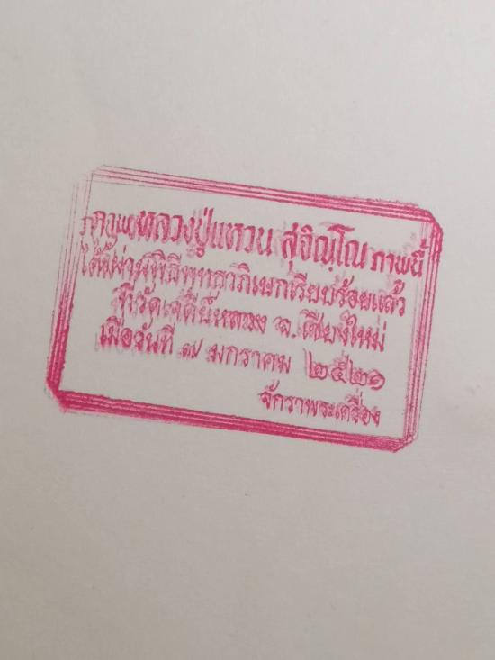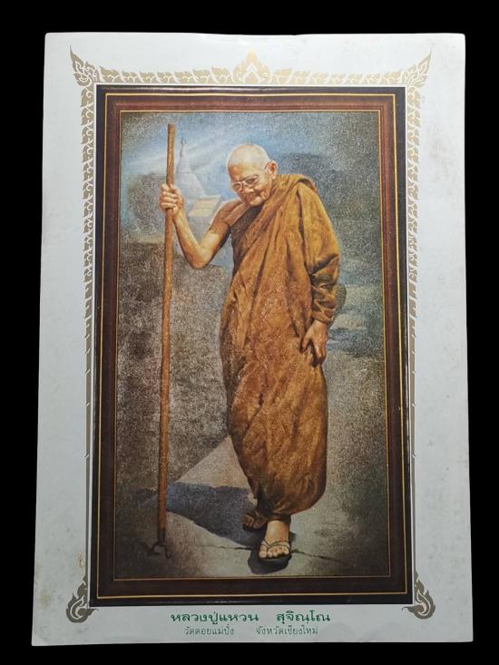 ภาพหลวงปู่แหวน สุจิณโณ ภาพนี้ได้ผ่านพิธีพุทธาภิเษกเรียบร้อยแล้ว ที่วัดเจดีย์หลวง จ.เชียงใหม่ เมื่อวันที่ 7 มกราคม 2521 ขนาดตั้งหรือแขวนบูชา ขนาด 10.5*13 นิ้ว ด้านหลังปั๊มหมึกแดง สภาพสวยเดิม ๆ |