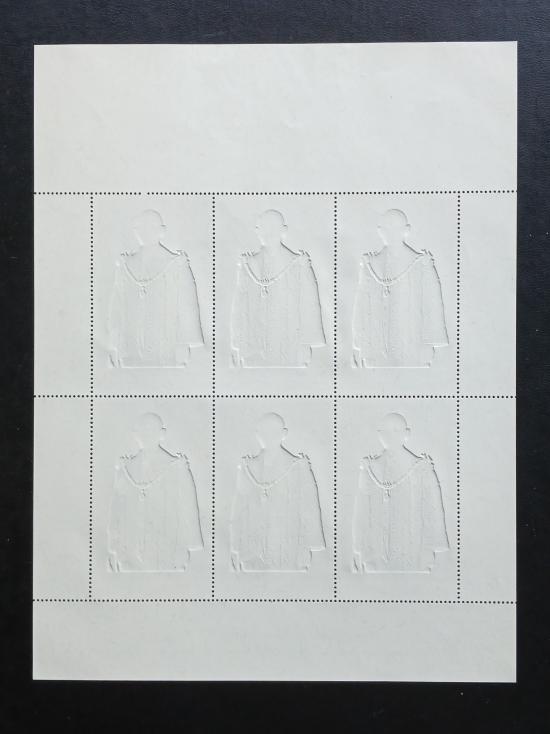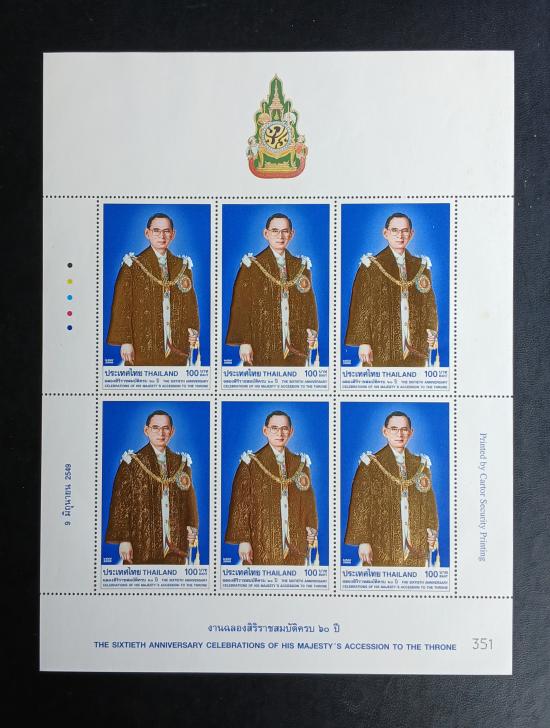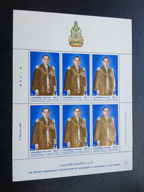 แสตมป์ทอง ในหลวง รัชกาลที่ 9 ชุดฉลองสิริราชสมบัติ 60 ปี พ.ศ.2549 หน้าดวง 100 บาท แบบเต็มแผ่น 6 ดวง (คู่มือ 900.-)
