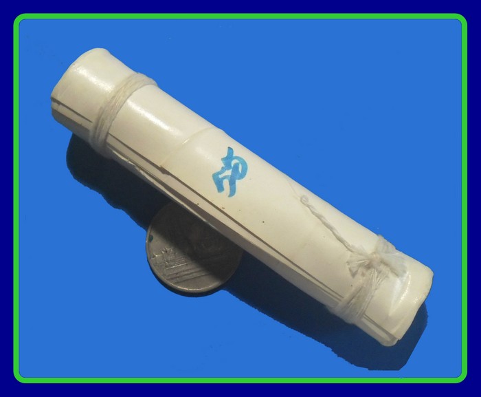 ตะกรุดพับจากใบอนุโมทนาบัตร มีจารปากกาเมจิคด้านหลัง