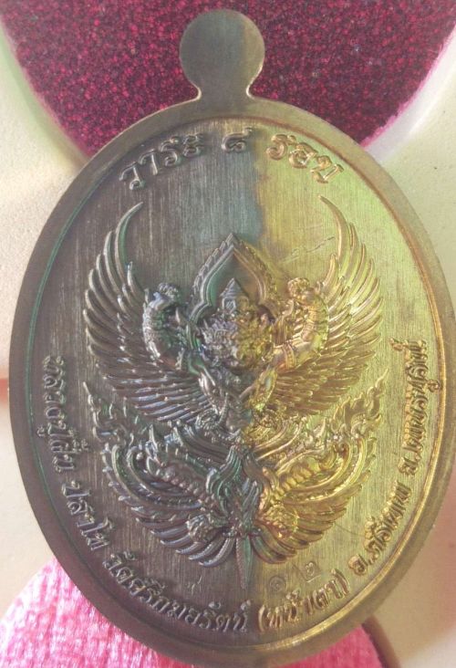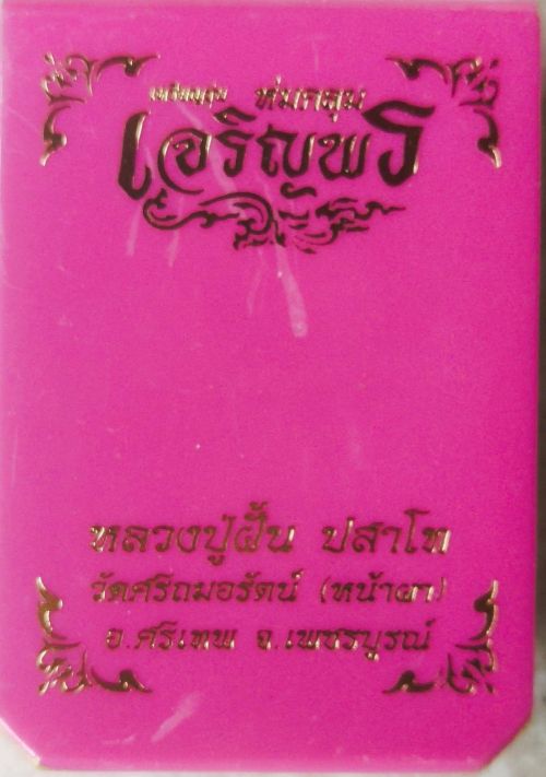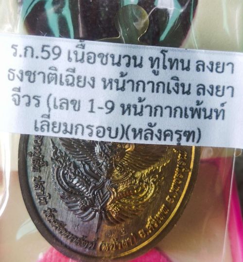 รายละเอียด เจริญพร ห่มคลุม หลวงปู่ฝั้น ปสาโท (วัดศรีถมอรัตน์ (หน้าผา) จ.เพชรบูรณ์) เนื้อชนวน ทูโทน ลงยา ธงชาติเฉียง หน้ากากเงิน ลงยาจีวร หมายเลข ๑๒ กล่องเดิม