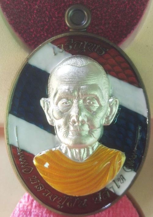 เจริญพร ห่มคลุม หลวงปู่ฝั้น ปสาโท (วัดศรีถมอรัตน์ (หน้าผา) จ.เพชรบูรณ์) เนื้อชนวน ทูโทน ลงยา ธงชาติเฉียง หน้ากากเงิน ลงยาจีวร หมายเลข ๑๒ กล่องเดิม