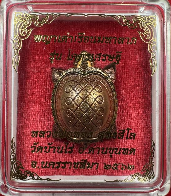 พญาเต่าเรือนมหาลาภ รุ่น "โคตรเศรษฐี"ด้านหลังอุดเบี้ยแก้ด้านในบรรจุปรอท ฝังตะกรุดมหาลาภเงินแท้ 2 ดอก เนื้อทองแดงลงยา 3 สี หลวงพ่อทอง วัดบ้านไร่ จ.นครราชสีมา |