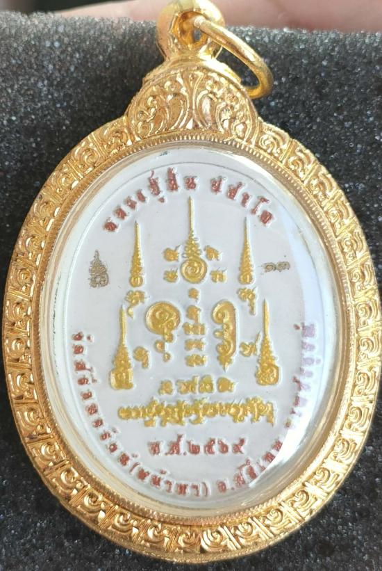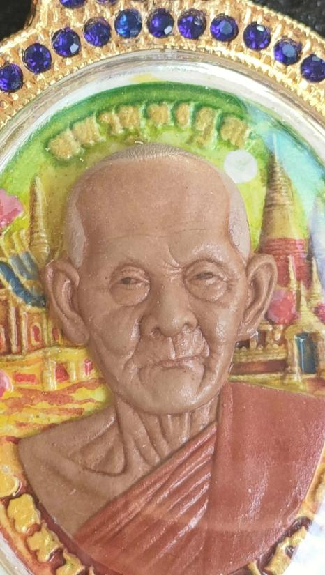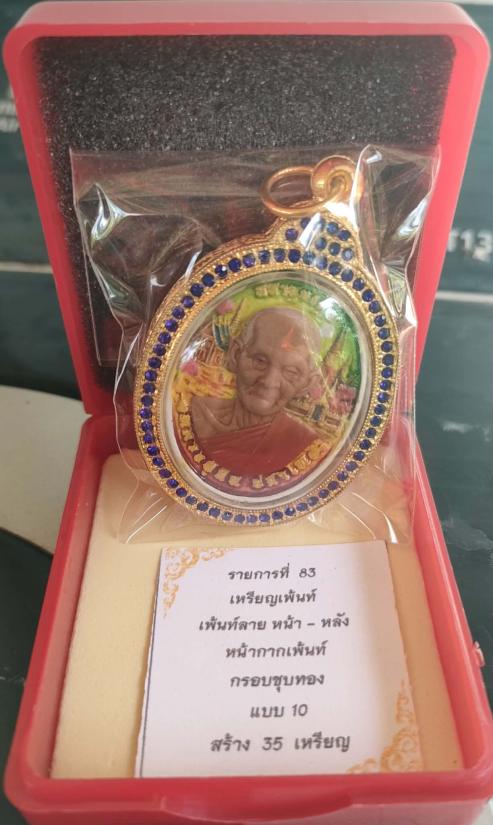เหรียญ"มหาพุทธคุณ" หลวงปู่ฝั้น ปสาโท วัดศรีถมอรัตน์(หน้าผา)จ.เพชรบูรณ์ เหรียญเพ้นท์ลายหน้า-หลัง หน้ากากเพ้นท์เสมือนจริง เลี่ยมกรอบชุบทองฝังพลอยน้ำเงินรอบ หมายเลข ๑๓ พร้อมกล่อง เลขโขคดี lucky number