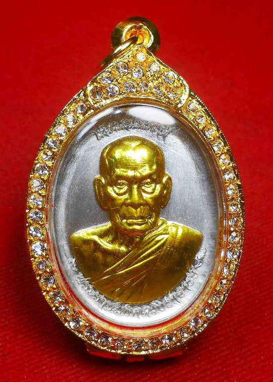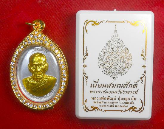เหรียญเลื่อนสมณศักดิ์ หลวงพ่อพัฒน์วัดห้วยด้วน (ป๋อง สุพรรณ การันตี) เนื้อปีกเครื่องบิน หน้ากากทองทิพย์ เลข 12751 พร้อมตลับทองฝังพลอยและกล่องเดิม