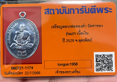 เหรียญรุ่นแรก หลวงปู่ทองดำ วัดท่าทอง จ.อุตรดิตถ์ เนื้อเงิน พร้อมบัตรรับรองการรันตีพระ