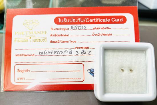 เพชรแท้ธรรมชาติ เหลี่ยมเบลเยี่ยมคัต แกะจากตัวเรือนสินหลุดจำนำ จำนวน 2 เม็ด น้ำหนักรวม 0.06 กะรัต น้ำประมาณ 93-94 SI1-VS |