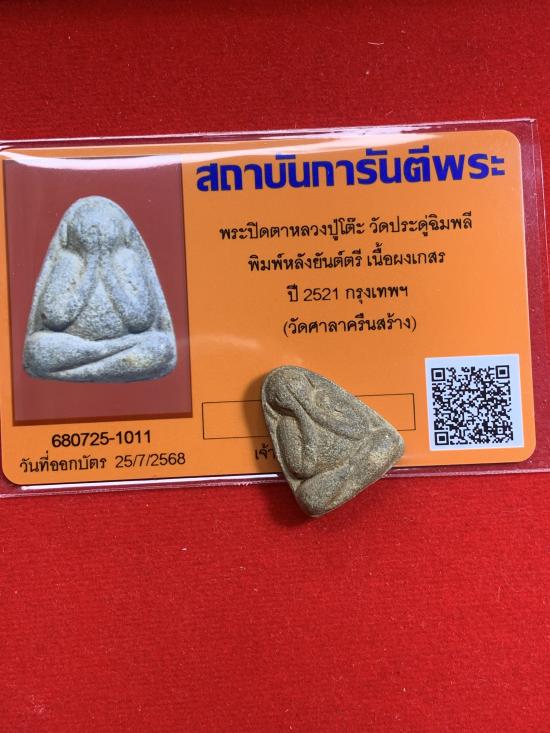 พระปิดตาหลวงปู่โต๊ะ วัดประดู่ฉิมพลี พิมพ์เล็กหลังยันต์ตรี เนื้อผงเกษร ปี 2521 กรุงเทพฯ (วัดศาลาครืนจัดสร้าง). พุทธคุณทางด้านแคล้วคลาด เมตตามหานิยม โชคลาภ ค้าขาย โดยเฉพาะการงานและการเงินเป็นเลิศมากครับ. องค์นี้เนื้อหาสมบูรณ์และสีสวยมาก เนื้อเกสรหายากส่วนใหญ่ที่เจอจะเป็นเนื้อผงใบลานครับ มาพร้อมบัตรรับรอง G-Pra เลี่ยมกรอบเงินชุบนากสั่งทำสวยงามมาก พร้อมบูชาครับ (ถ้าทำกรอบ 2,000 บาทครับ).