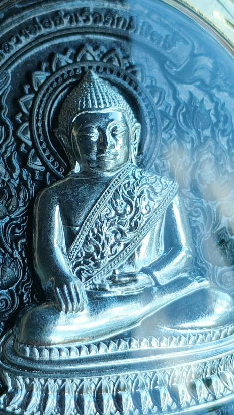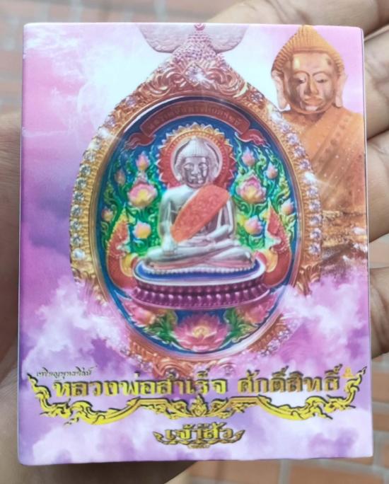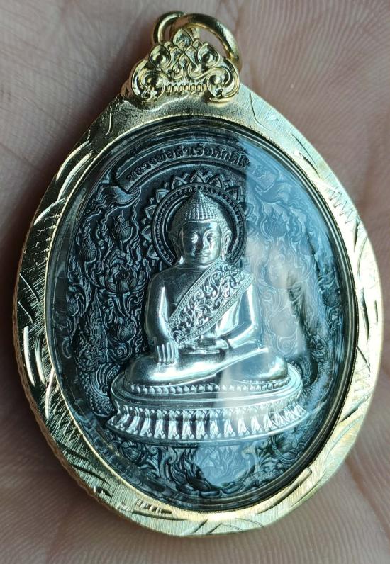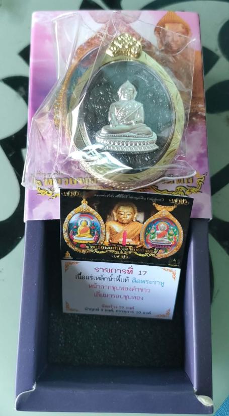 เหรียญพุทธศิลป์ หลวงพ่อสำเร็จศักดิ์สิทธิ์รุ่น"เจ้าสัวยุค๙" บ้านหนองตาโล่ สระบุรี เนื้อแร่เหล็กน้ำพี้แท้ หน้ากากชุบทองคำขาว หลังติดพระราหู เลี่ยมกรอบชุบทอง หมายเลข ๒๕ พร้อมกล่อง เสริมโชค เสริมดวงชะตา