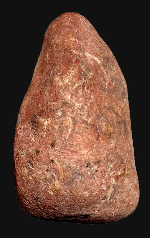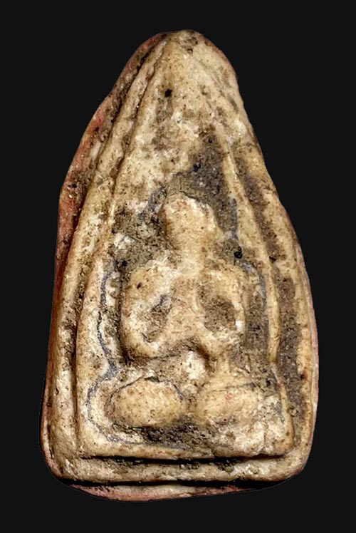 เนื้อผงแห้งเก่ามีอายุมีคราบกรุ จารดินสอด้านหน้า หลังจารยันต์ปาดปูนแดง