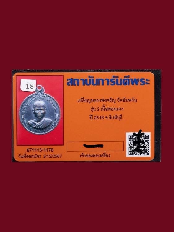 เหรียญหลวงพ่อจรัญ รุ่นสอง ปี 18 พร้อมบัตร