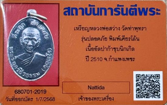 เหรียญปลอดภัย หลวงพ่อสว่าง วัดท่าพุทรา พิมพ์เศียรโล้น เนื้ออัลปาก้าชุบนิกเกิล ปี 2510 จ.กำแพงเพชร. เหรียญประสพการณ์รุ่นนี้ ได้รับฉายาว่า หลวงพ่อปลอดภัย เพราะผู้ที่นำไปใช้ มักจะ แคล้วคลาด ปลอดภัยค่ะ |