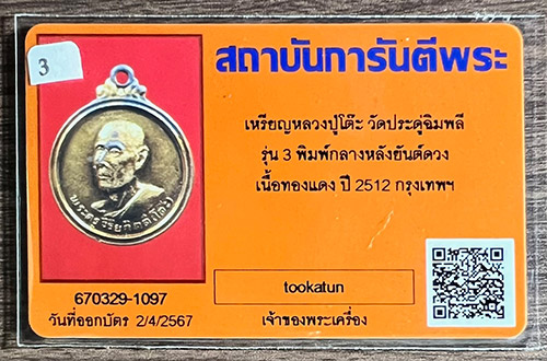 เหรียญรุ่น3 พิมพ์กลางหลังยันต์ดวง ปี12 เนื้อทองแดง สภาพสวย จมูกโด่ง หน้าตาติดชัด ผิวไฟแดงแป๊ดๆๆ พร้อมบัตรรับรองพระแท้