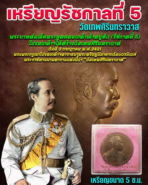 เหรียญรัชกาลที่ 5 วัดเทพศิรินทราวาส เนื้อทองแดง ปี 2521 ปลุกเสกพิธีใหญ่ ลป.โต๊ะ ลพ.เงิน วัดดอนยายหอม ร่วมปลุกเสก เหรียญนี้เป็นเหรียญใหญ่ขนาด 5 ซม. ปั๊มหนา สวยเดิมๆครับ...!