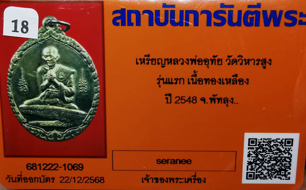 เหรียญหลวงพ่ออุทัย วัดวิหารสูง รุ่นแรก เนื้อทองเหลือง ห่วงเดิม ปี2548 จ.พัทลุง + บัตรG-pra สภาพสวยเดิมค่ะ