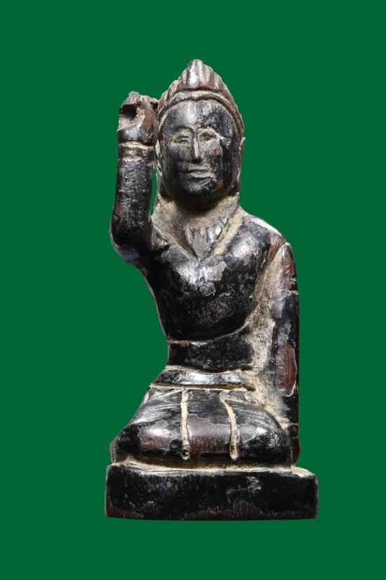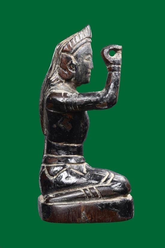 นางกวักไม้แกะลงรักปิดทองเก่า กวักเงินกวักทอง ขนาดบูชาอายุเก่าร้อยปีผิวหิ้งไม่ทราบที่ ขนาดความกว้างฐาน 2.0 นิ้ว ความสูง 4.0 นิ้ว