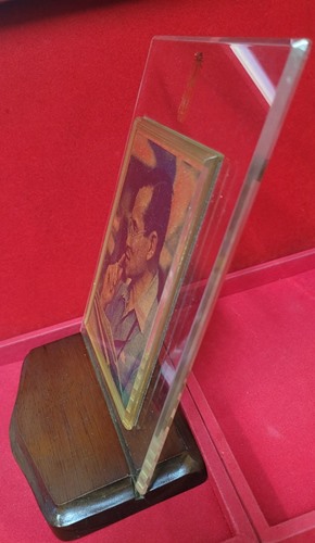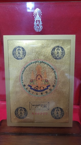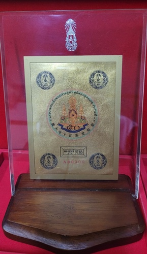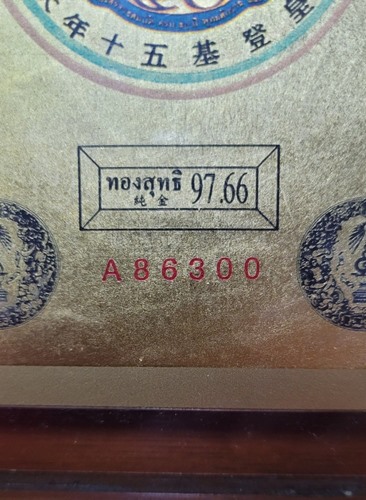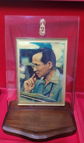พระบรมฉายาลักษณ์ทองคำ ฉลองสิริราชสมบัติครบ 50 ปี ทองคำสุทธิ 97.66 % เป็นแผ่นทองคำพิมพ์ภาพสี สภาพสวยมาก พร้อมแท่นไม้ และกรอบอะคริลิค (ไม่มีกล่องกระดาษ)