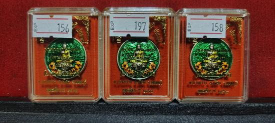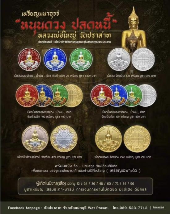 เหรียญ หนุนดวงเศรษฐีปลดหนี้ พระพุทธปราสาททอง(หลวงพ่อใหญ่) วัดปราสาท(โบราณสถานแห่งชาติ) จ.นนทบุรี ปี2565 เนื้อกะหลั่ยเงินลงยาเขียว สร้าง199องค์ จององค์ละ499บาท เปิด3องค์ หมายเลข156/197/158 ประกันแท้