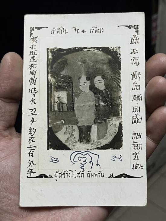 ภาพเจ้าสัวจีน จื่อ&เหลียง ขนาดโปสการ์ด ผู้สร้างโบสถ์ วัดอัมพวัน สิงห์บุรี (สมัยกรุงศรีอยุธยา) ภาพนี้ถ่ายจากของจริงแล้วอัดจัดทำขึ้นปี ในสมัยฉลองบูรณะพระอุโบสถใหม่ในปี 2513 มีจารยันต์มือด้วยปากกา ในสมัยหลวงพ่อจรัญ วัดอัมพวันเป็นเจ้าอาวาส