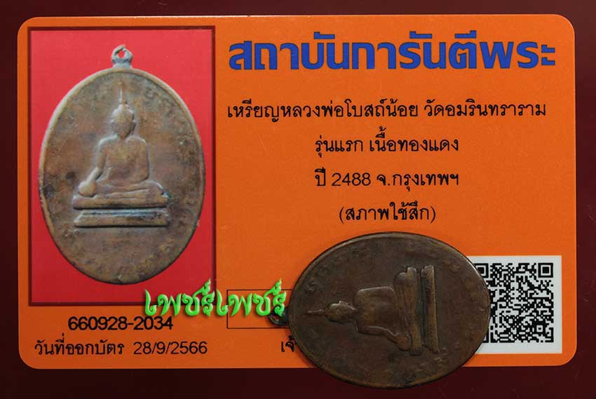 เหรียญ หลวงพ่อโบสถ์น้อย วัดอมรินทราราม รุ่นแรก เนื้อทองแดง ปี2488 จ.กรุงเทพฯ สภาพน่าใช้ เก่าเดิมๆตามอายุหายาก พร้อมบัตรรับรองพระแท้จากการันตีพระสบายใจได้พระแท้แน่นอน ค่ะ