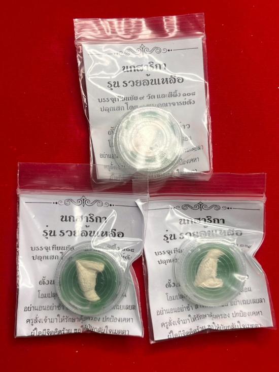 นกสาริกา รุ่นรวยล้นเหลือ บรรจุเทียนชัย 9 วัด และสีผึ้ง108 ปลุกเสกโดย 9 พระคณาจารย์ดัง (1กระดาน 3 อัน) |