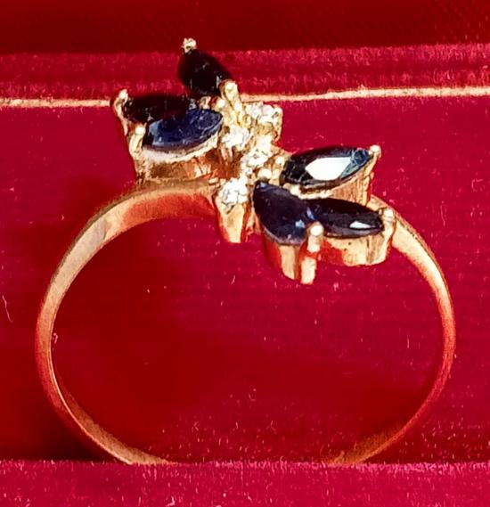แหวนทองเหลืองขัดเงา หัวแหวนเป็นหนามเตยเกาะพลอยไพลินสีน้ำเงินเข้มเกือบดำ เพชรประดิษฐ์ ทรงดอกไม้สามกลีบไขว้ ไซซ์ประมาณ 57 วงนี้อายุหลายสิบปี สภาพตามรูป ราคาเบา ๆ ครับ แถมแหวนงานจิวเวอร์รี่ ไซซ์ประมาณ 54 ให้อีก 1 วง สุดคุ้ม ส่งฟรีทั่วไทย รับประกันตามกฎครับ