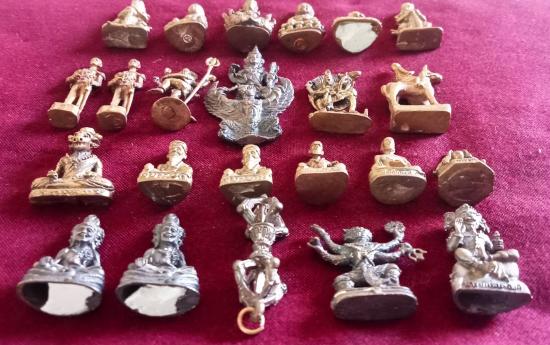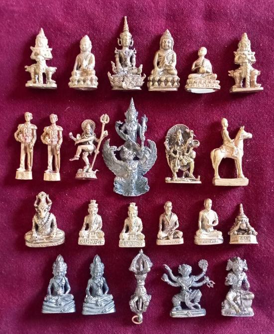 รูปหล่อหลายองค์ ไม่ทราบที่ เนื้อทองเหลืองบ้าง ทองเหลืองรมดำบ้าง ขนาดห้อยคอ รวม 23 องค์ มีหลากหลาย ทั้ง พระศรีอารยเมตตรัย พระกริ่ง พระอุปคุต ท้าวเวสสุวรรณ พระนารายณ์ กรมหลวงชุมพรฯ พระบรมรูปทรงม้า ร. 5 พระฤๅษี หมอชีวก พระราหู หนุมานแผลงฤทธิ์ และเครื่องราง เป็นต้น ราคาวัดใจเบา ๆ ตกองค์ละ 15 บาทเท่านัั้นครับ สภาพไม่ผ่านการใช้ตามรูป ส่งฟรีทั่วไทย รับประกันตามกฎครับ