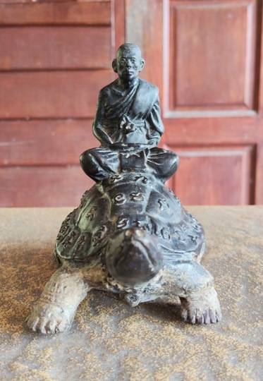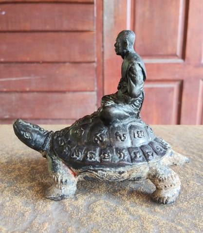 พระบูชาหลวงปู่หลิวนั่งเต่า วัดไร่แตงทอง รุ่นเศรษฐีมหาศาล ปี 2554 เนื้อทองเหลืองรมดำ มีจาร ความยาวเต่า 6 นิ้ว สูง 5 นิ้ว อ.ชลสร้าง |