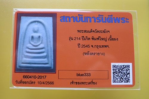 พระสมเด็จวัดระฆัง รุ่น 214 ปีเกิด พิมพ์นิยมเกศทะลุซุ้ม ปี 2545 พิธีใหญ่ หลวงปู่หมุน วัดบ้านจานร่วมปลุกเสก กล่องเดิม สวยๆ