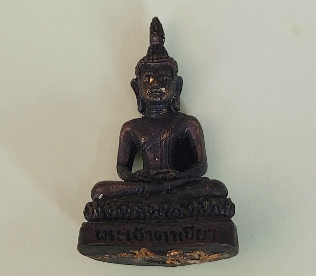 รูปหล่อพระเจ้าตาเขียว วัดบ้านเหล่าพระเจ้าตาเขียว อ.ป่าซาง ลำพูน โลหะรมดำปิดทอง 2537 ตอกโค๊ดที่ฐานพร้อมกล่องเดิม |