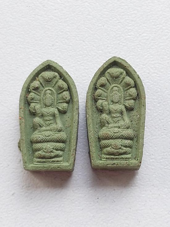 จตุคามรามเทพ พิมพ์ปรกใบมะขาม ผ่าตะวันปี 50 เนื้อเขียวกตัญญู จำนวน 2 องค์ มี 1 องค์ที่มีเกศาของครูบาอาจารย์ตามลูกศรสีแดง เนื้อเขียวกตัญญูหายากนะครับ ถ้าเป็นสายพุทไธจะทราบดีว่านิยมเนื้อเขียวกัน บางท่านก็ถือเคล็ด เขียวเหนี่ยวทรัพย์ พระพิมพ์เนื้อผงจตุคามสีเขียวราคาค่านิยมก็จะมากกว่าสีอื่นๆครับ เปิดราคาเบาๆ