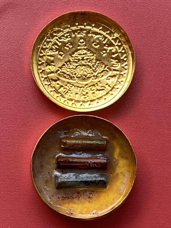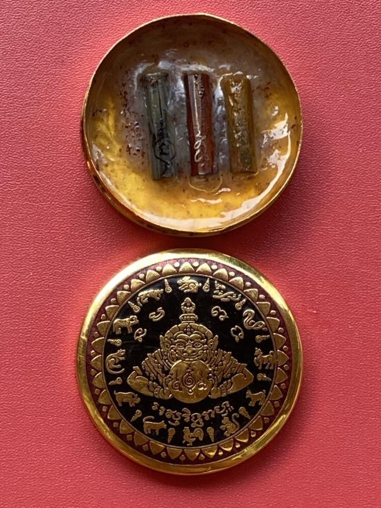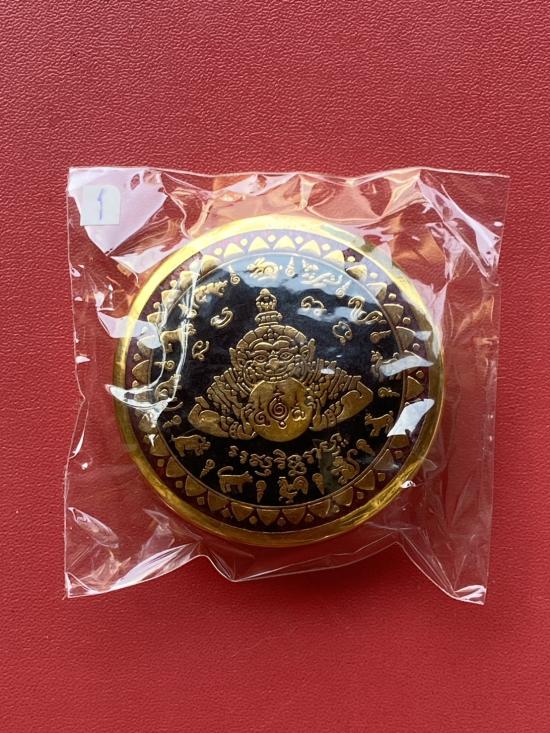เคาะเดียวแดง สีผึ้งพระราหู รุ่น มงคลจักรวาล เนื้อ โลหะชุบทองลงยาสีดำขอบสีแดง ขนาด 5ซม |