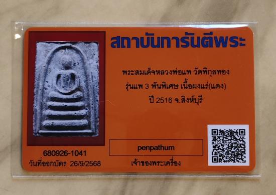 สมเด็จแพ 3 พัน เนื้อผงแร่แดง ปี2516 หลวงพ่อแพ วัดพิกุลทอง + บัตรจี
