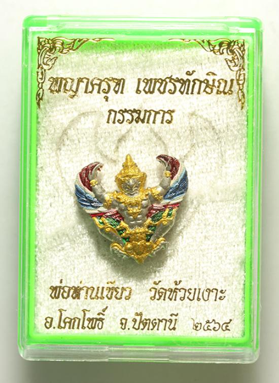 พญาครุฑ ปั้มหน้าหลัง รุ่น เพชรทักษิณ ครุฑ รุ่นสุดท้ายของพ่อท่านเขียว วัดห้วยเงาะ ปี 2564 พิมพ์เล็ก ขนาดสูง 2 ซม. สวยเดิม พิธีใหญ่ เนื้อ เงินยวงลงยาธงชาติ จากชุด กรรมการพร้อมกล่องเดิม